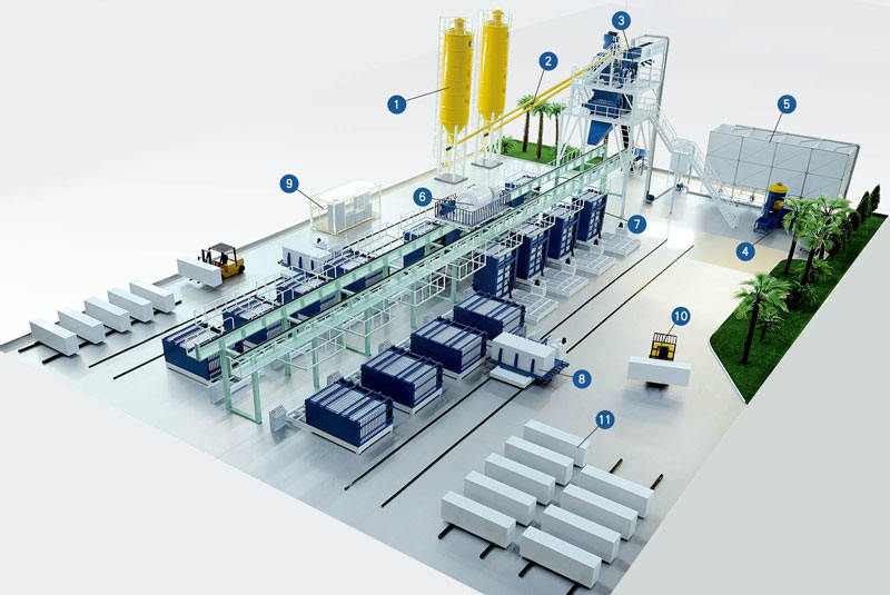 主要由配料系統(tǒng)、攪拌系統(tǒng)、輸送注料系統(tǒng)、成型系統(tǒng)、碼垛裝置等設(shè)備組成,自動化程度高。 該生產(chǎn)線通過立式注模、臥式脫模,可達(dá)到更高的產(chǎn)品成品率和改善工人的工作難度,并可使機(jī)械的占地面積往高度方向,減少占地。 特點 該輕質(zhì)墻板生產(chǎn)線采用連續(xù)出料攪拌技術(shù)。該技術(shù)不僅可解決不間斷的注料,會使物料產(chǎn)生分離不一致的品質(zhì)問題;而且在連續(xù)的物料輸出基礎(chǔ)上可有效地提高生產(chǎn)速率。 配套設(shè)備 1、水泥筒倉 2、螺旋輸送機(jī) 3、攪拌系統(tǒng) 4、EPS預(yù)發(fā)機(jī) 5、EPS儲存?zhèn)} 6、注漿系統(tǒng) 7、臥立式液壓成型機(jī) 8、移動式自動脫模機(jī) 9、控制系統(tǒng) 10、叉車 11、成品堆放場 |