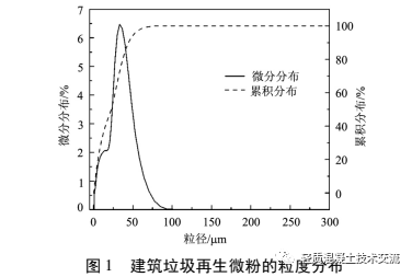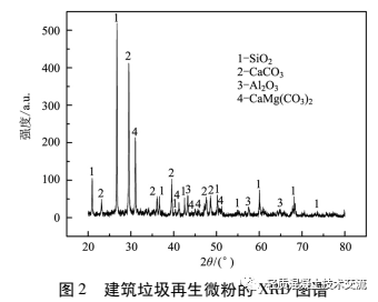 式破碎機(jī)破碎, 過 200 目方孔篩得到建筑垃圾再生微粉, 篩余量小于 5% 。建筑垃圾再生微粉的粒度分布和 XRD 圖譜分析如圖 1、2 所示。由圖譜分析