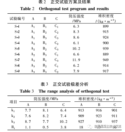 3) 選取陶粒堆積密度的最小 k 值作為物料配合比確定依據(jù), 此時(shí)所對應(yīng)的組合方案為 A2B3C1, 也是正交試驗(yàn)組 S-6, 此 時(shí) 陶 粒 的 堆 積 密 度 為 889kg·m - 3。從建筑垃圾的利用率以及水泥的消耗量來綜合考慮, 可以選擇 A2B3C1 為最優(yōu)配合比方案。