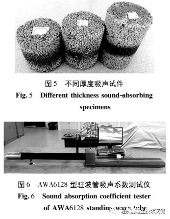 本文以建筑垃圾陶粒為骨料制成的多孔水泥基陶粒吸聲降噪材料, 其抗折強(qiáng)度為 2. 5 ~ 3. 3 MPa、抗壓強(qiáng)度為 10 ~ 12 MPa, 能夠滿足水泥基陶粒吸聲材料抗折強(qiáng)度大于 2 MPa、抗壓強(qiáng)度大于 8 MPa 的力學(xué)性能要求。經(jīng)過試驗(yàn)得到地鐵軌道交通吸聲降噪材料的配合比為: 粒徑范圍為 1 ~ 8 mm 陶粒為60% ~ 65% 、水泥為 30% ~ 35% 、水灰比為 0. 24 ~0. 28、外加劑為 0. 5% ~ 1. 5% 。將各材料組分進(jìn)行混合拌制, 制作出直徑為 96 mm, 高度分別為 100mm、120 mm、150 mm 的圓柱體吸聲試件, 如圖 5 所示。采用杭州愛華 AWA6128 型駐波管吸聲系數(shù)測試儀進(jìn)行材料吸聲系數(shù)測試, 測試儀如圖 6 所示。采用聲學(xué)駐波管法測試出陶粒吸聲材料的吸聲系數(shù)曲線, 如圖 7 所示 。